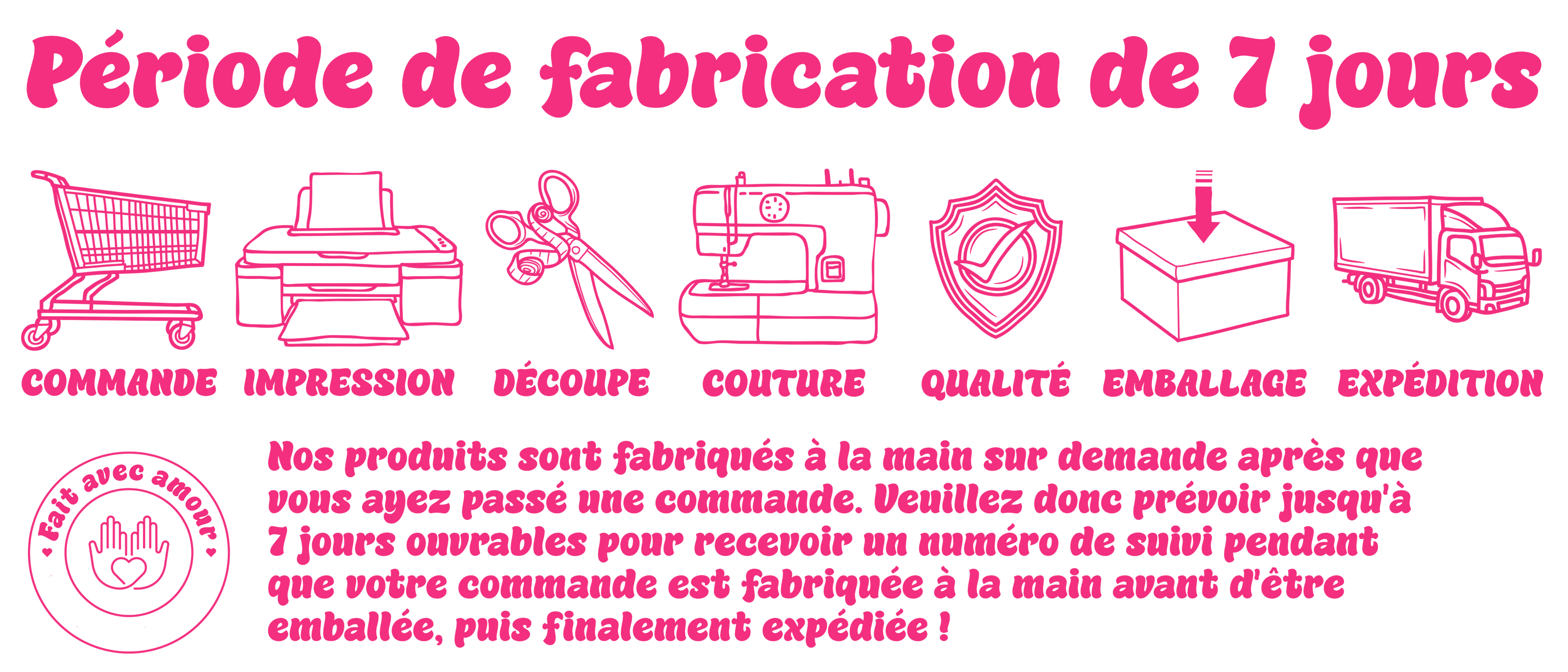 Tous nos articles sont fabriqués sur demande. Cela signifie que dès que vous commandez, nous nous mettons au travail pour produire votre article ! Juste pour vous !